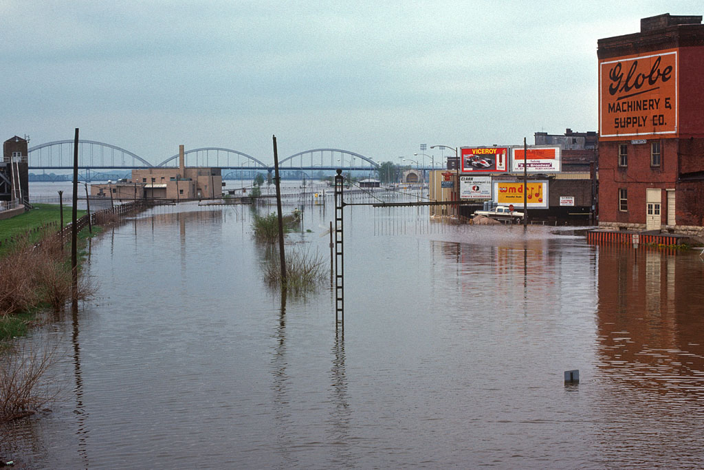 Looking downriver in flooded downtown Davenport. The view is from the Government Bridge and the Dri-Line is underwater to the left, along the main channel of the river. You can see the Dam #15 on the left edge of the photo. Davenport is the largest city on the Mississippi without any flood wall to this day. |