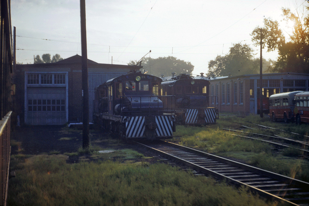 Here's another view of the NS&T shop environs with freight motors #14 and #15 waiting in the early morning. |
