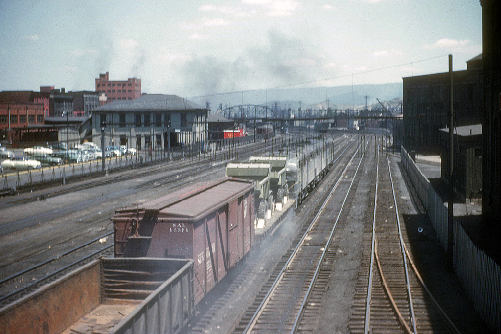 Of all the thousands of cars that rolled through Altoona on that July day in 1952, a couple at the head end of a manifest, PRR 9615 east, are identified over 60 years later: loaded flat with a pair of dump trucks on it and a Seaboard Air Line boxcar. |