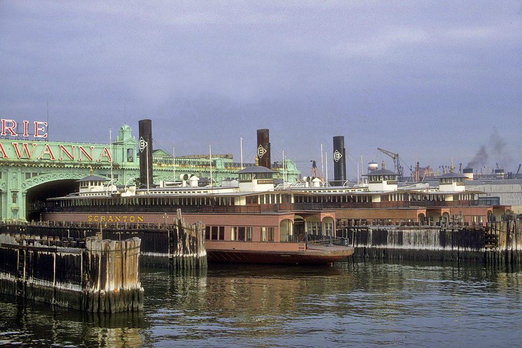 L-R: The "Scranton", the "Pocono", and the "Binghamton", making for a stately, graceful, elegant lineup. Not all that long before this photo was taken, these three graceful, turn of the century coal-burners were still in service, carrying well-dressed commuters between Hoboken and lower Manhattan. On January 1st, 1968, during a gusty storm, the "Scranton" broke loose from her Hoboken moorings and then drifted out into the Hudson, where she sank shortly thereafter. For some time, her stack and one pilothouse were still visible above the murky surface of the Hudson; at the time of her sinking, there were a number of newspaper stories about this once-proud ferry and her fateful, one-way voyage. One news article claimed that the "Scranton" really died of a broken heart. I well remember seeing her stack jutting eerily out of the water from my brother's kitchen window on the east side of Union City, overlooking the Hudson, in early 1968. A menace to navigation, she was later raised, and, what was left of her, was scrapped at Jersey City. It was a sad ending indeed for a graceful and historic vessel, one that I have many fond childhood memories of. |