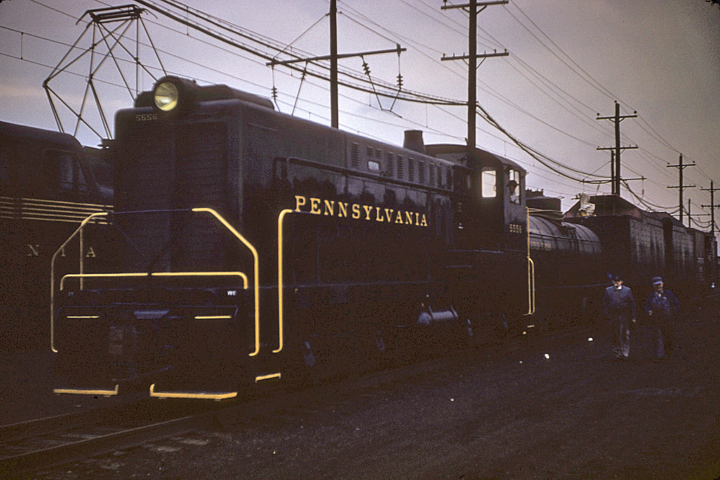 In the gathering late afternoon darkness an apparent conversation between manager and crew is captured. Baldwin #5556 is shined up, probably wiped down by hand with an oily rag as per standard custom for special occasions on the PRR. This photo likely a sister to the other view showing tenders first, taken from the other end of the consist. |