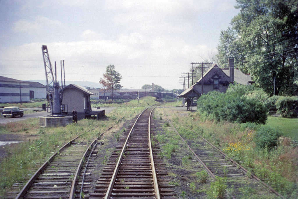 Temple, PA. Tuckerton Road crossing to the rear of the station. RDG on left side of photo. Late BM&R Temple station sits where crane and freighthouse are. Ramp and coal dock in distance are still in place. |