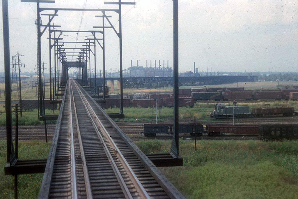 Venice Hi-Line, Venice power plant, and McKinley Bridge in distance. passing over the top of the TRRA Madison yards |