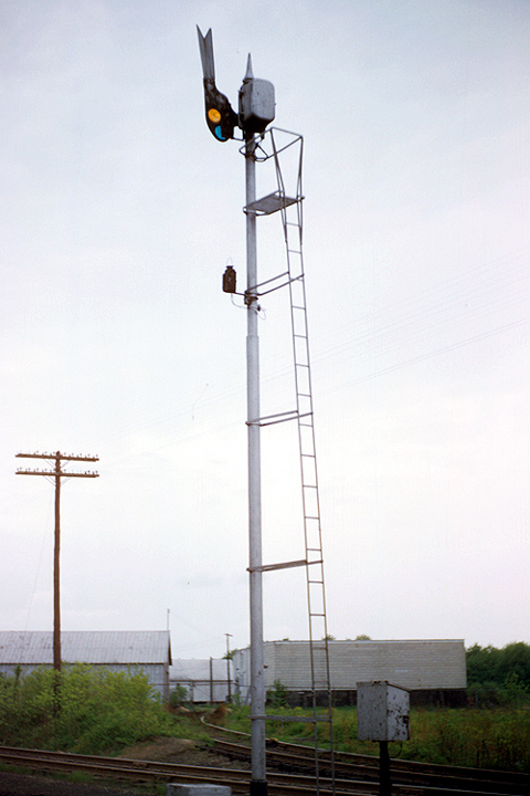 This is a Union Switch & Signal T-2 top-of-mast semaphore configured as a distant signal and cannot display stop or red. There is virtually no doubt the next signal is an "absolute" interlocking signal which by the then I.C.C. was required to display red unless the interlocking was cleared by the operator. Only then could this signal display clear as shown here. The lower aligned lamp is proof of it being an interlocking distant approach signal. |